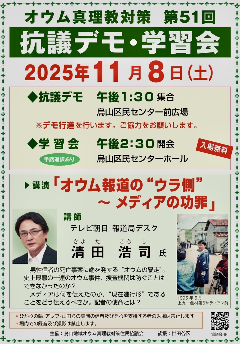 2025-10-14 第51回「オウム真理教抗議デモ・学習会」11月8日(土)開催です! お知らせ 「烏山地域オウム真理教対策住民協議会」主催の「オウム真理教抗議デモ・学習会」が11月8日(土)に開催されます。詳細、以下のチラシをご覧下さい。 どなたでも参加できます。※ ひかりの輪、アレフ、山田らの集団の信者及び支持する者の入場は禁止区議会としても、オウム真理教問題を風化させないよう取り組んでいるところですが、 私個人としても、今年3月の議会と、今議会(先週)続けて、「オウム真理教問題」について取り上げています。 具体的には、「オウム真理教地下鉄サリン事件から30年という節目の今年、区独自でこれまでの活動の歴史を動画で残すとよいのでは?」ということを提案しています。 区の担当所管からは、「住民協議会の皆さまとスケジュール等を含め、詳細に協議し、実施に向けて検討する」と、非常に前向きな答弁が得られました。 以下、そのやりとりの議会中継です。 ※ カルト宗教問題関連の質疑、1つ目は統一教会関連、2つ目がオウム真理教関連(最初から4分30秒進めたところから) https://setagaya-city.stream.jfit.co.jp/?tpl=play_vod&inquiry_id=9739 お一人でも多くの方にご参加いただけますよう、よろしくお願いいたします。 🌟田中優子 X → https://twitter.com/setagaya_tanaka 🌟2分でわかる!田中優子プロフィール動画 → https://youtu.be/ECp5Ihy0jvQ